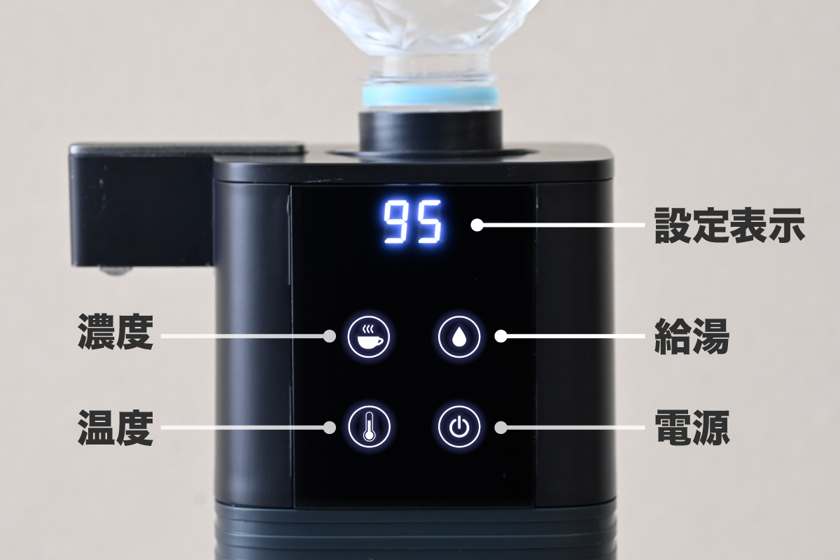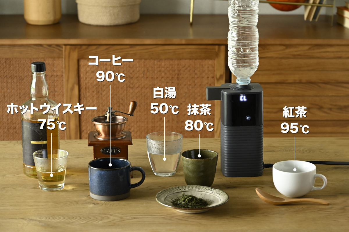 温度設定は、常温・50℃から95℃まで5℃単位で調整可能。飲み物それぞれの最適温度に対応します。