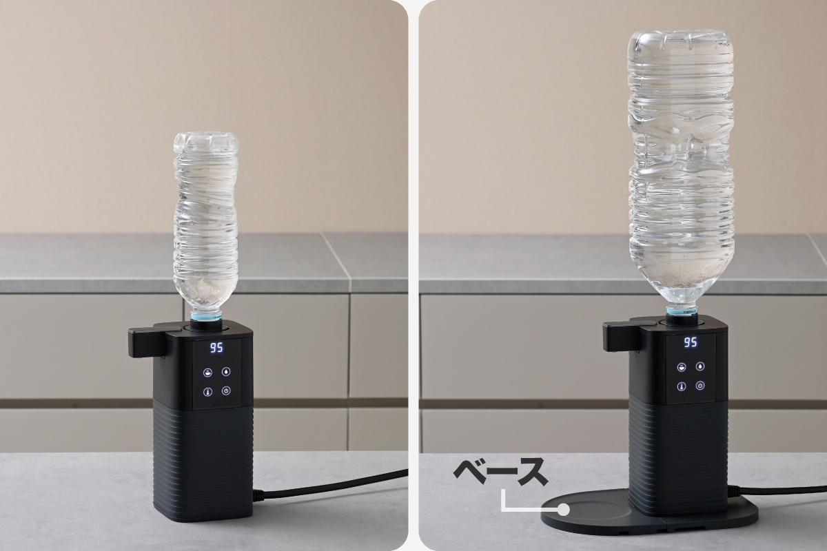 600ml以上のペットボトルを使用する時は必ずベースを取り付けてください。