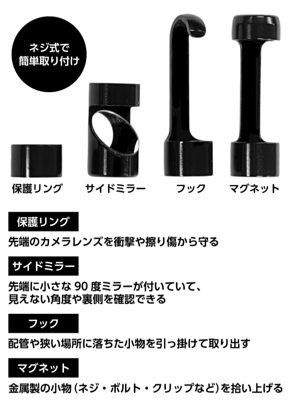●暗い配管の中や、機械の中の確認や狭い場所の探索に。小さい部品のピックアップに。 |