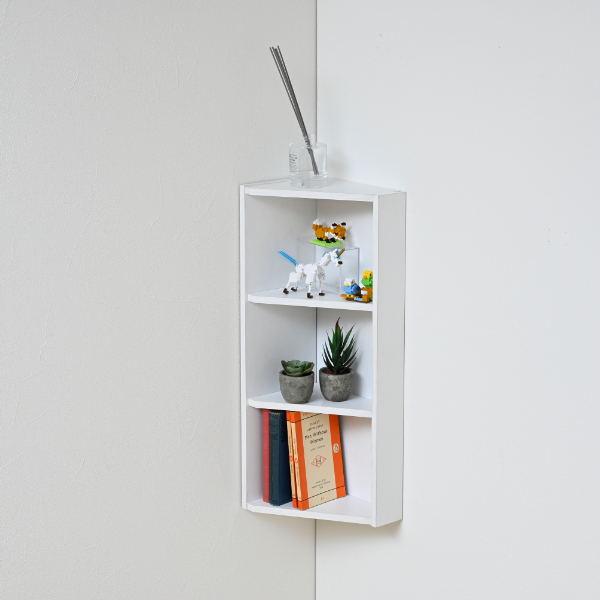 賃貸でもOK!付属ピンで石膏ボードに取り付ける壁掛け家具シリーズのコーナータイプ。横向きで飾り棚としても使えます。