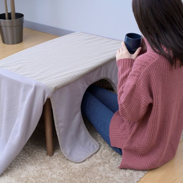 ソファーに座りながら使いやすい、こたつと布団の2点セットです。夏はテーブルとして一年中使えます。
