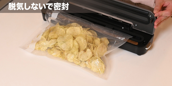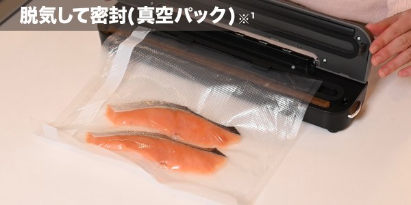 食品に合わせて、「脱気して密封(真空パック)※¹」「脱気の途中で密封」「脱気しないで密封」の3通りの密封方法が可能です。
