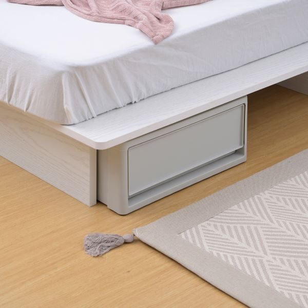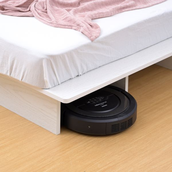 床面下が貫通しているので、ロボット掃除機が入って掃除しやすい設計になっています。幅39cm×奥行54cm×高さ19cmまでの衣装ケースも入ります。