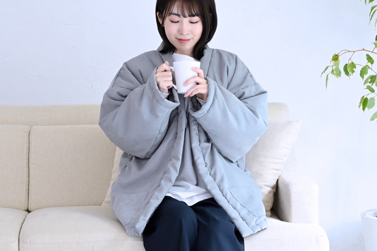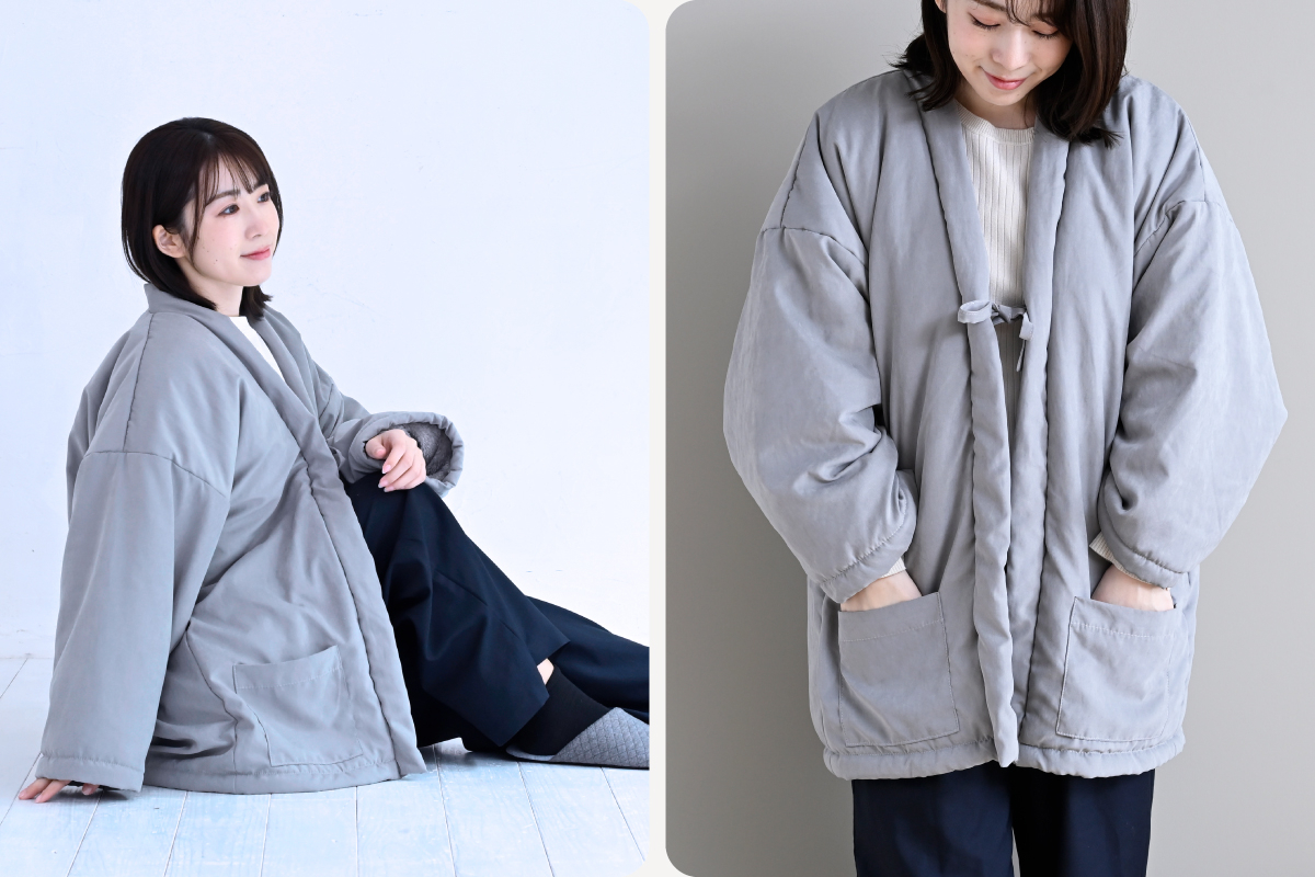 従来のポンチョ風から半纏型に変更し、腕まわりにゆとりを持たせることで、動きやすい設計に変更。室内の移動や家事などの動作がしやすくなりました。