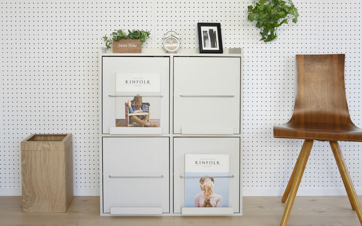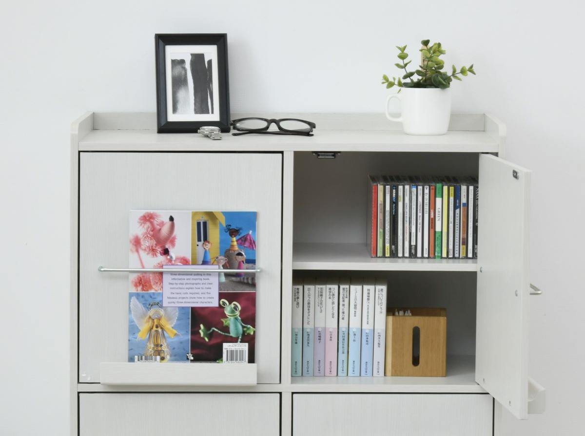 扉には落下を防止するホルダーが付いているので、薄い雑誌や絵本でもオシャレにディスプレイすることが出来ます。