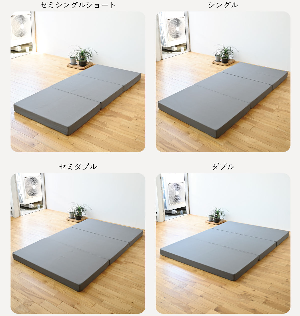 サイズはセミシングルショート(SSS/幅80cm)、シングル(S/幅97cm)、セミダブル(SD/幅120cm)、ダブル(D/幅140cm)の4種類からお選びいただけます。