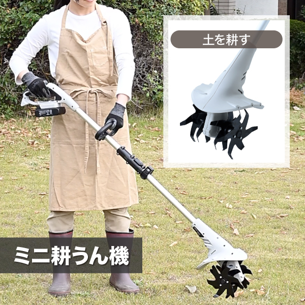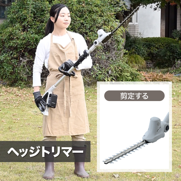 用途に応じて先端アタッチメントを付け替えることで、耕うん、草刈り、剪定など、庭のさまざまな作業に対応します。