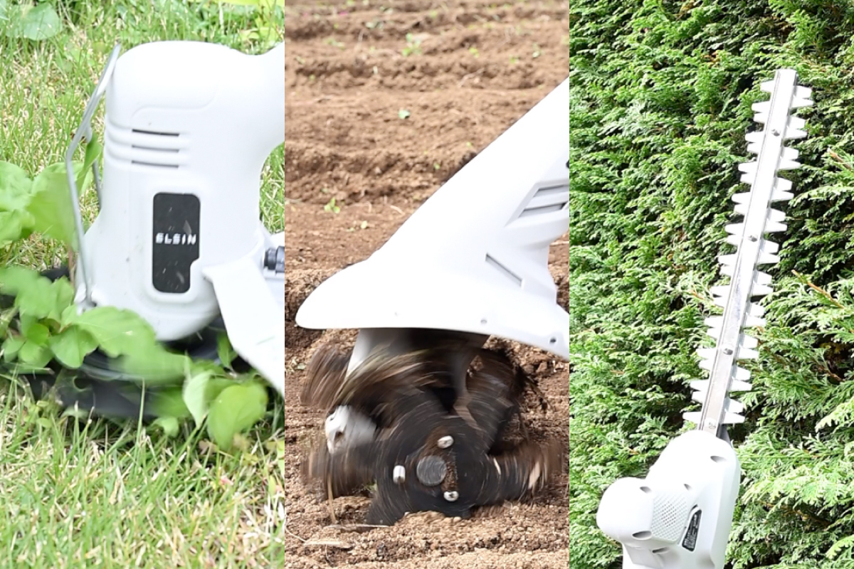 【ELEIN(エレイン)シリーズ】先端アタッチメントを付け替えるだけで1台3役に!カルチベータ (ミニ耕うん機) 、グラストリマー (草刈り機)、ヘッジトリマーの3点セットです。