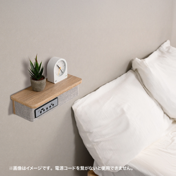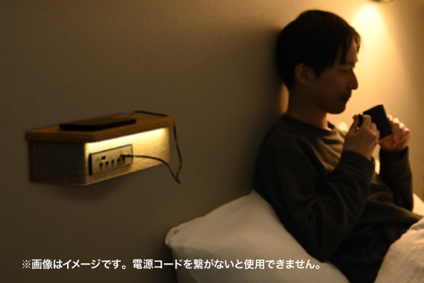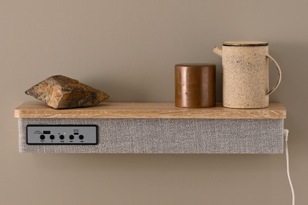シェルフ下部 (天板裏) に搭載したライトは、間接照明のように柔らかいオレンジ色の光が特徴的です。ベッドサイドに設置すれば、就寝前のリラックスタイムにぴったりな落ち着いた空間を演出できます。