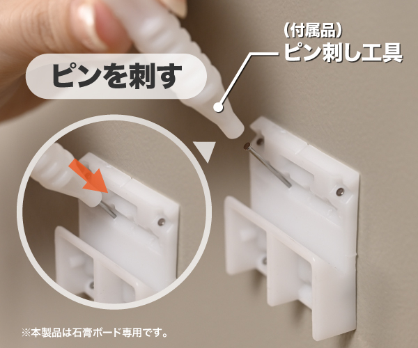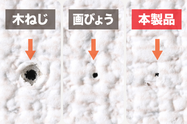 ホッチキス針と同等の極小サイズの跡しか残らないため、木ねじや画びょうと比べて取り付け時の壁の傷や跡も目立ちにくい設計です。