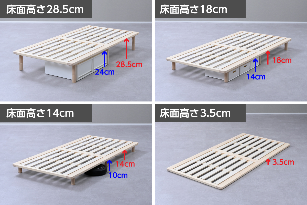 | 仕様 | ●脚を取り付けるだけの簡単組み立て ●折りたたんでスリムに収納可能 ※中央の金具は必ず上向きにしてください。自立はしません。 ●高さは4段階で変更できます ●床面は通気性の良いすのこ ●静止耐荷重:200kg ●傷防止のフェルト付き ●床面高(本体高さ): 28.5、18、14、3.5cm ●ベッド下高さ:24、14、10cm |
