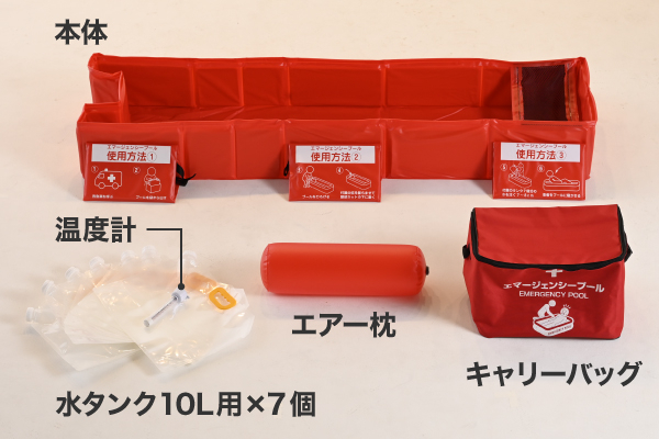 | 商品説明 | ●熱中症が疑われる際に体表面を冷却するための緊急用簡易プール ※医療機器ではございません ●救急車が到着するまでの間に行う応急対応キット ※使用中は患者から目を離さないでください ●付属品:本体、エアー枕、水タンク10L用×7個、温度計、キャリーバッグ ●水温管理と給水までワンセット |