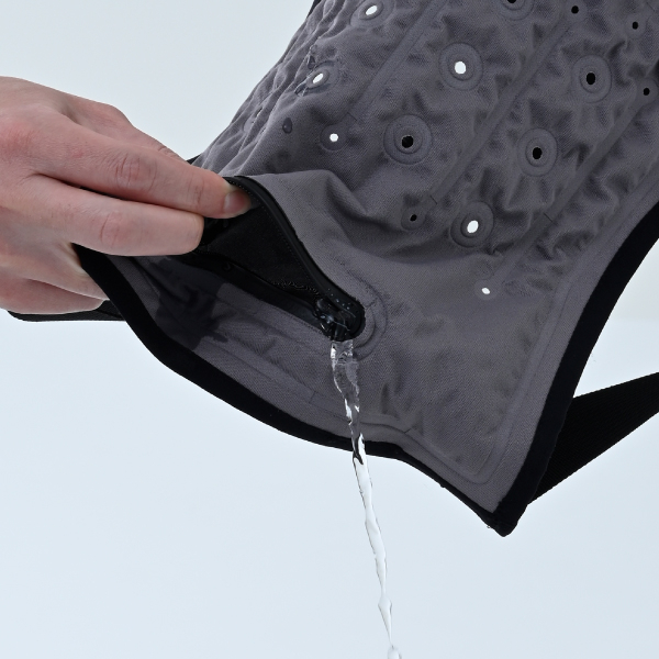 ファスナーをあけて逆さにすることで水を排出できるため、数時間で乾きます。中綿を使用せず水を含ませる独自の構造により、乾きにくく臭いが出る問題を解消しています。