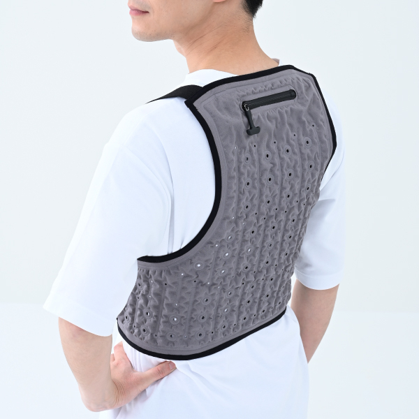 ベスト内部に水を浸透させ、浸透させた水の冷たさと、外側から徐々に蒸発する際の気化熱によって身体を冷やします。