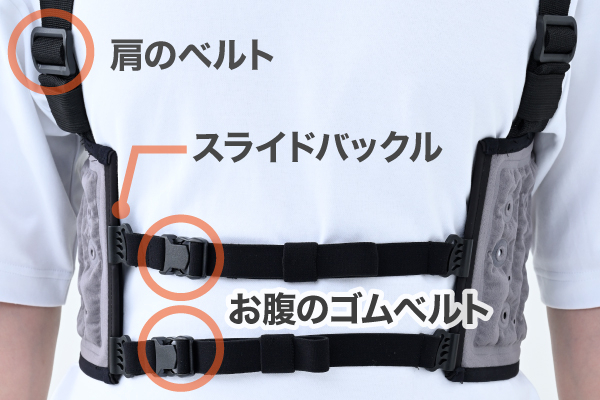 肩のベルトやお腹のゴムベルト、スライドバックルにより体型に合わせてフィット感を調整可能です。
