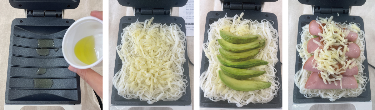 ③ホットサンドメーカーにオリーブ油を薄く塗り、水気を切ったそうめんをのせる。
