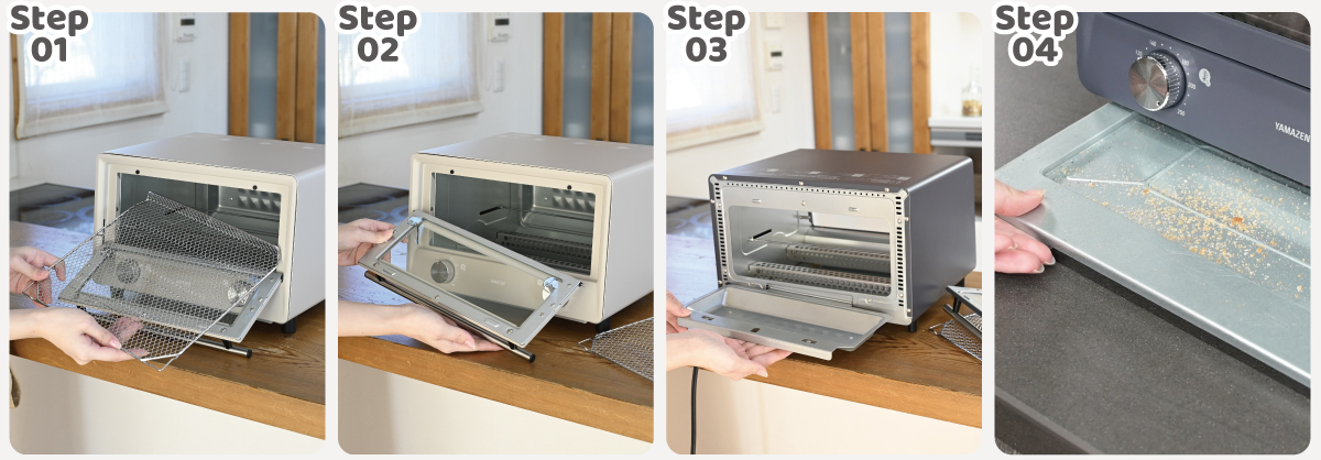 焼き網、受け皿、パンくずトレイは丸洗いOKです。