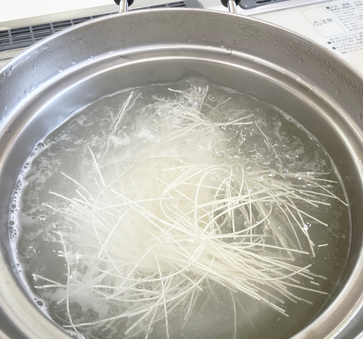 ③そうめんは半分の長さに折り、ゆでてザルにあげ、冷水でもみ洗いし水気をきります。
