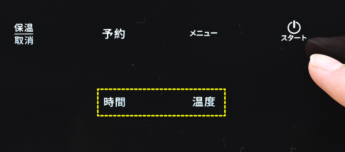 「時間」ボタンで調理時間を、「温度」ボタンで調理温度を設定します。「スタート」ボタンに触れると調理が始まります。