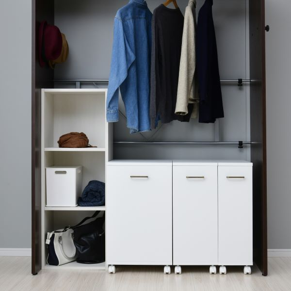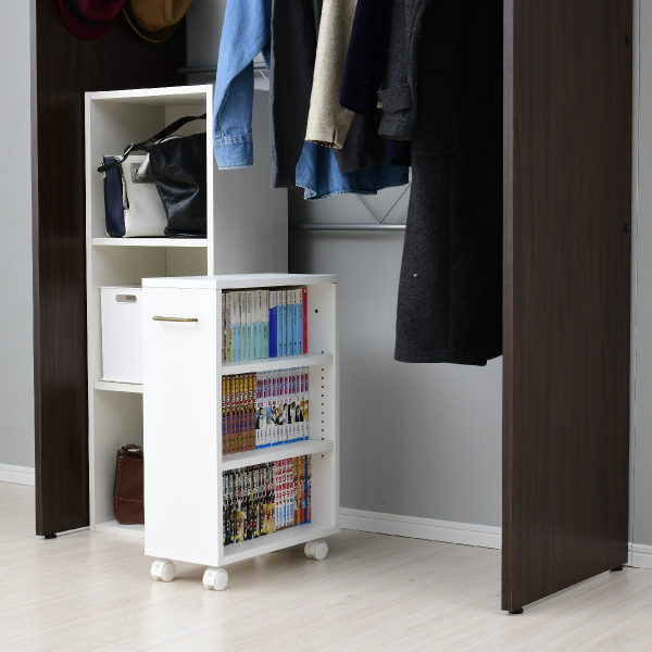収納が少ない日本の住宅では、クローゼット活用術は今や当たり前。クローゼットは奥の荷物が取り難いなど奥行きを活かせないことが多いですが、キャスター付なら出し入れ簡単。天板は収納台にもなり、空間を有効活用できます。直射日光が当たらないので、大切な本も日焼けさせずに保管できます。