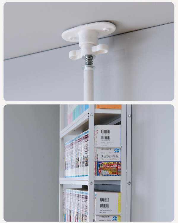 天井と床で突っ張ることで固定する突っ張り式本棚。壁面などを収納スペースに活用できるのが特徴です。突っ張るだけなので、本棚を設置するために穴を空けるなど特別なDIYも不要で、賃貸などでもお使い頂けます。