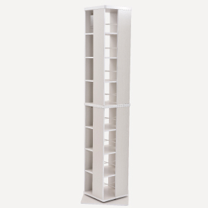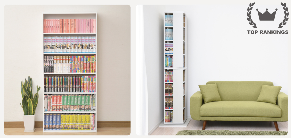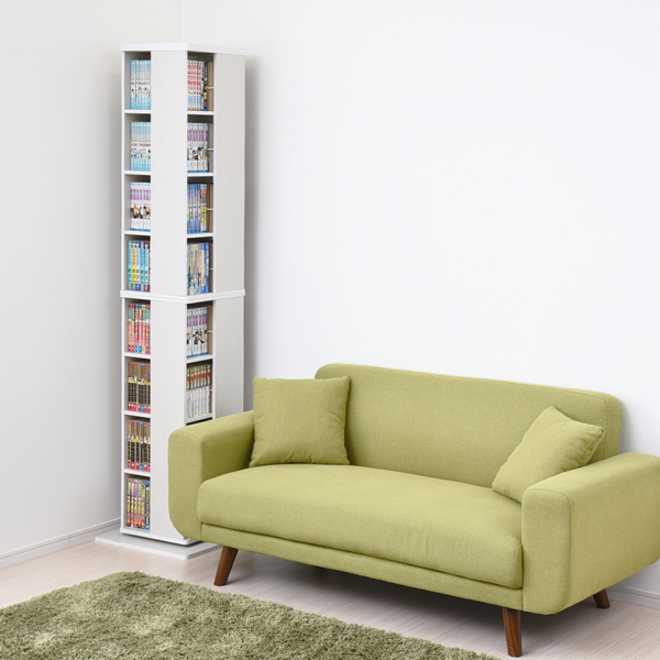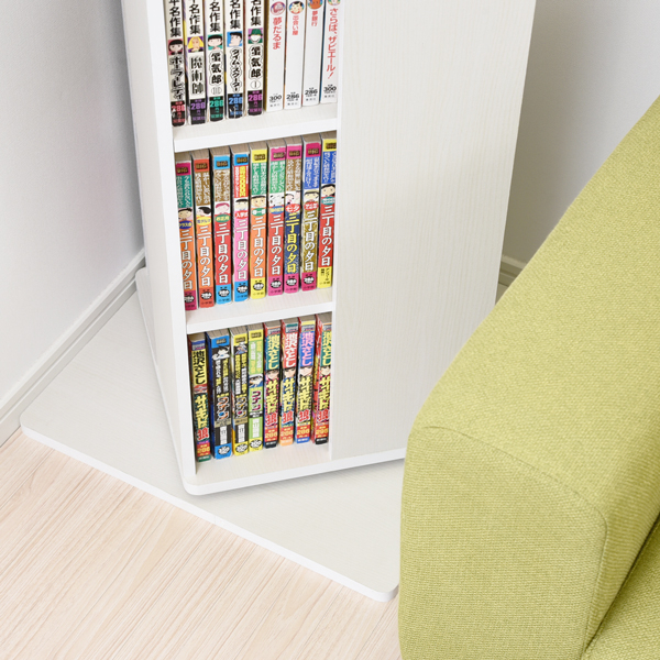 回転式本棚は、通常の本棚とは異なり棚全体が360°回転するため、収納スペースを効率的に活用できるデザインが特徴です。『360度 回転コミックラック 8段 DSRR-8』は、45cmのすき間にコミックなら約320冊収納出来るので、限られた空間を縦に活用して省スペースで収納できます。