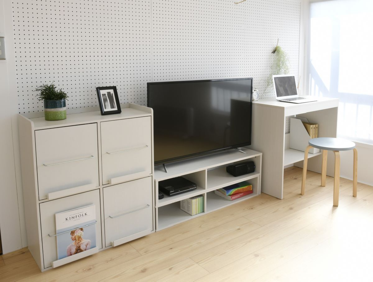 見せる/隠す収納が両立できるディスプレイラックは、読みかけの本などを整理して置ける上、本を読み進める効果もある他、突然の来客時にごちゃごちゃ感を隠すこともできる優れもの。小さいお子様向けの本を置いて、「あの本、あそこに戻してきて!」と、お片付けの練習にもなります。