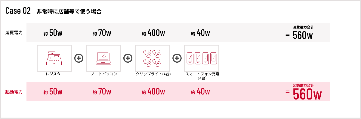 使いたい電気製品の電力が確認できたら、次は最適な発電機を選びましょう。起動電力を計算することで、どれぐらいの発電量をもつ発電機が適しているかが分かります。使用する電気製品の起動電力の合計値を、発電機の定格出力(※)と比較してみましょう。